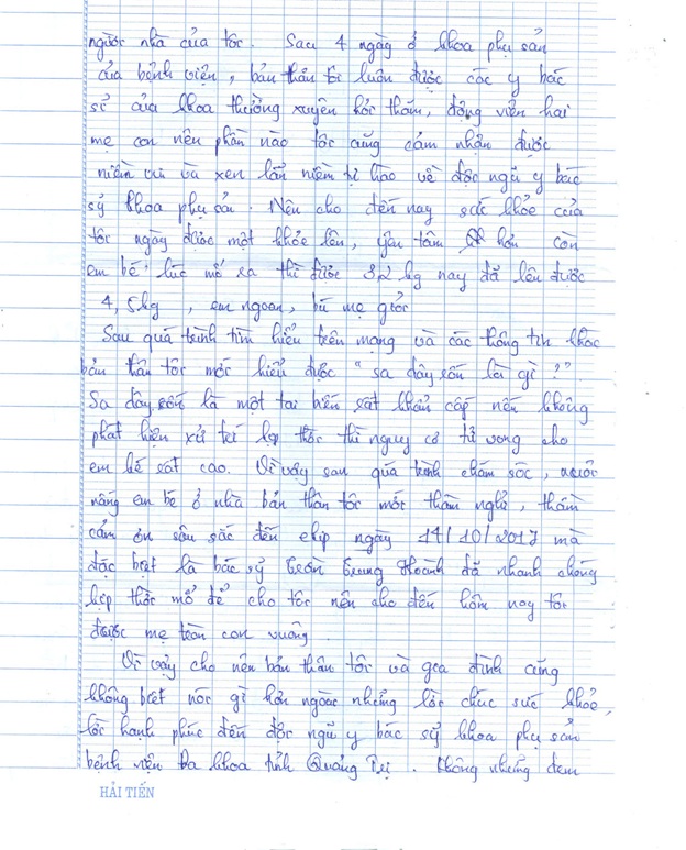 Một thư khác của bệnh nhân Trần Thị Hiền sinh năm 1994 ở tại Đông Hà, Quảng Trị điều trị tại Khoa Phụ Sản cũng đã chia sẻ qua bức thư được mở trong tuần như sau: “Vào ngày 14 tháng 10 năm 2017, sau những lần đau bụng và ra dịch âm đạo nên tôi được người nhà đưa đến Bệnh viện khám. Vào phòng sinh tôi được trực tiếp bác sĩ Trần Trung Hoành thăm khám và được nhanh chóng chuyển mổ (bác sĩ chẩn đoán bị sa dây rốn, em bé rất yếu). Sau hơn 10 phút thì ca mổ đã xong và em bé được đưa ra ngoài, lúc này tôi được các bác sĩ đưa tới khoa Hồi sức nằm để theo dõi còn em bé được đưa vào phòng khác để ê kíp kiểm tra, theo dõi cùng người nhà của tôi. Sau 4 ngày ở Khoa Phụ Sản, bản thân tôi luôn được các bác sĩ của Khoa thường xuyên thăm hỏi, động viên hai mẹ con nên phần nào tôi cũng cảm nhận được niềm vui và xen lẫn niềm tự hào về đội ngũ y bác sỹ Khoa Phụ Sản. Nên cho đến nay, sức khỏe của tôi ngày một được khỏe lên, ngày một khỏe lên, yên tâm hơn, còn em bé lúc mổ ra thì được 3,2 kg nay đã lên được 4,5 kg”.