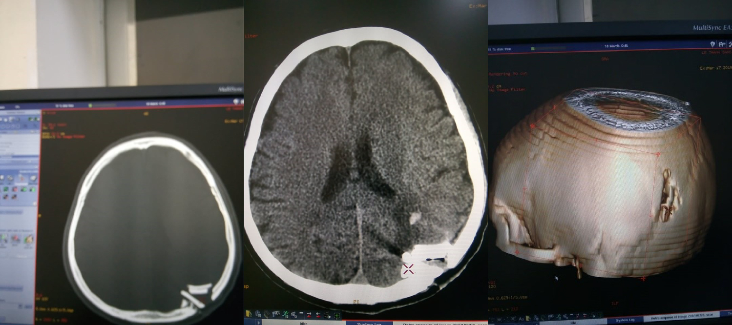 Kết quả: Hình ảnh Vở lún xương hộp sọ có mảnh rời, kèm viêm dập não, xuất huyết dưới nhện tại vùng đỉnh-chẩm trái (có tái cấu trúc dựng hình 3D)